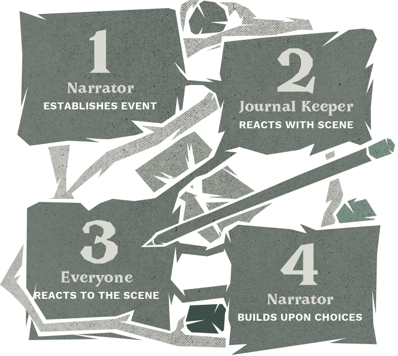 The Narrator takes the actions, builds encounters around them, and explains how the players are changing the setting. With these changes, the Cast and Journal Keeper have a new set of items to interact with and new actions they will want to take.